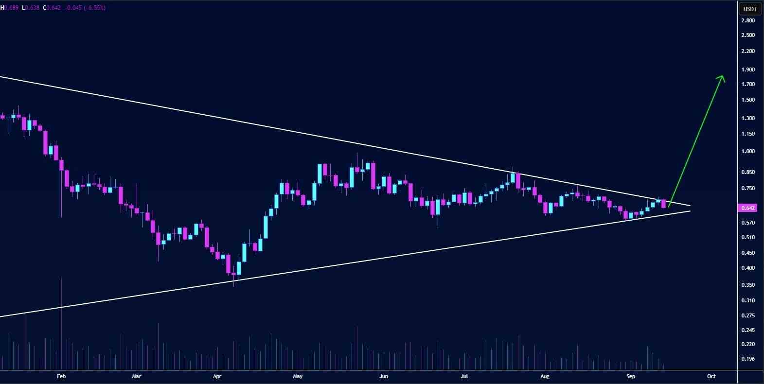 در نمودار ۲ روزه در حال آزمایش مقاومت بالایی الگوی مثلث متقارن است.فشار شکست بهسرعت در حال افزایش است و در صورت عبور گاوها، قیمت میتواند تا ۱.۹۰ دلار صعود کند.